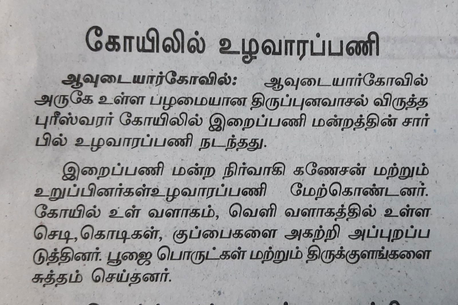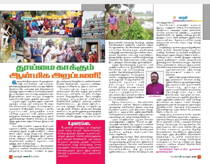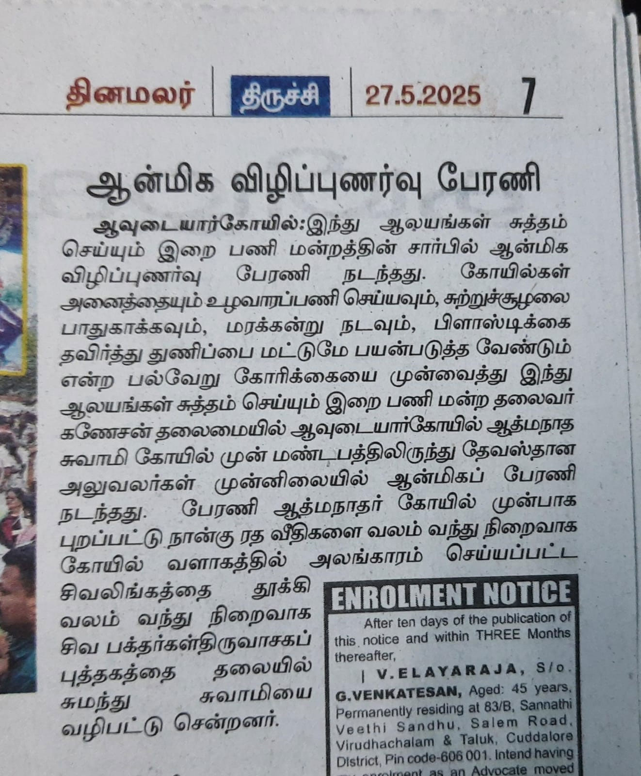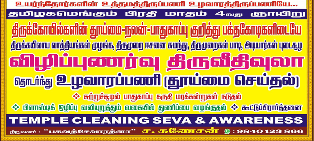 இந்து ஆலயங்கள் சுத்தம் செய்யும் இறை பணி மன்றம் சார்பில் கடந்த 23 ஆண்டுகளாக தமிழகமெங்கும் உள்ள திருக்கோயில்களின் தூய்மை நலன் பாதுகாப்பு குறித்து பக்த கோடிகளிடையே பன்னிரு திருமுறை நாதர் சுமந்து கயிலாய வாத்தியங்கள் முழங்க விழிப்புணர்வு பதாகைகள் ஏந்தி பிரச்சுரங்கள் வழங்கி விழிப்புணர்வு ஏற்படுத்தி வருகிறோம் தொடர்ந்து உழவாரப்பணி (தூய்மை செய்தல்) மற்றும் சுற்றுச்சூழல் பாதுகாப்பு கருதி மரக்கன்று நடுதல் மற்றும் பிளாஸ்டிக் தவிர்க்கும் வகையில் துணிப்பை வழங்குதல் இறுதியாக ஐந்தெழுத்து மந்திரம் ஓதி உலக நலன் வேண்டி கூட்டுப் பிரார்த்தனை