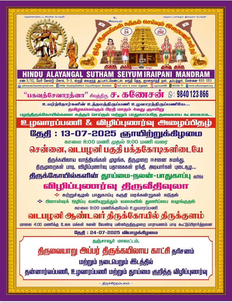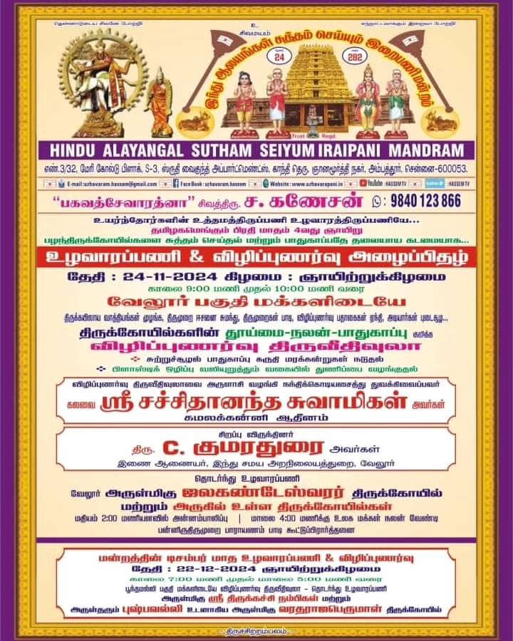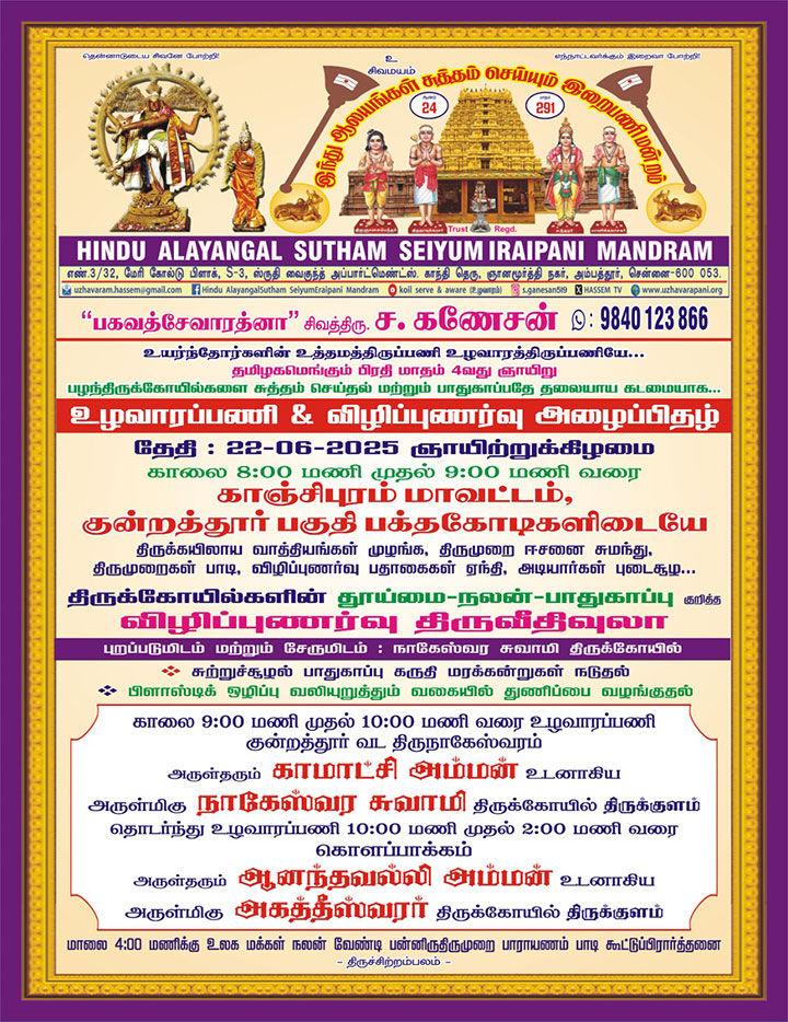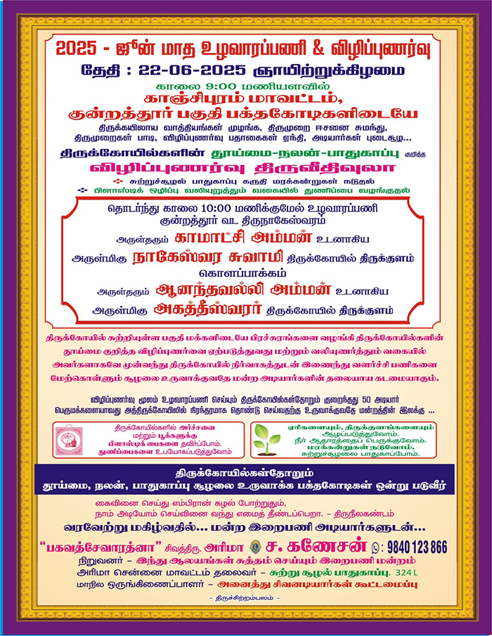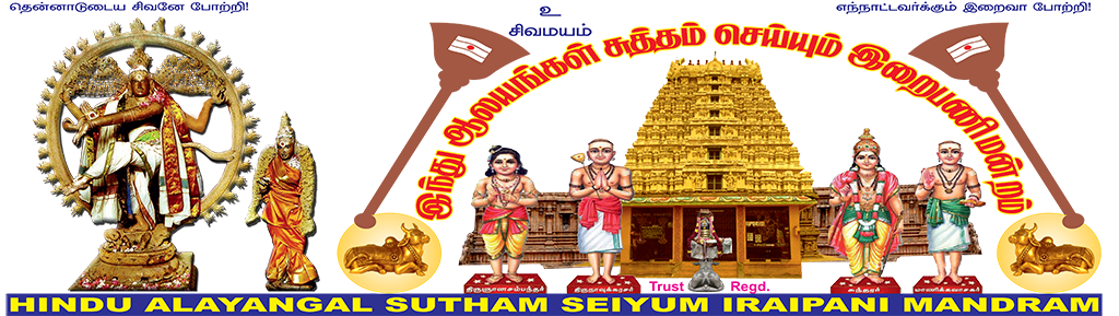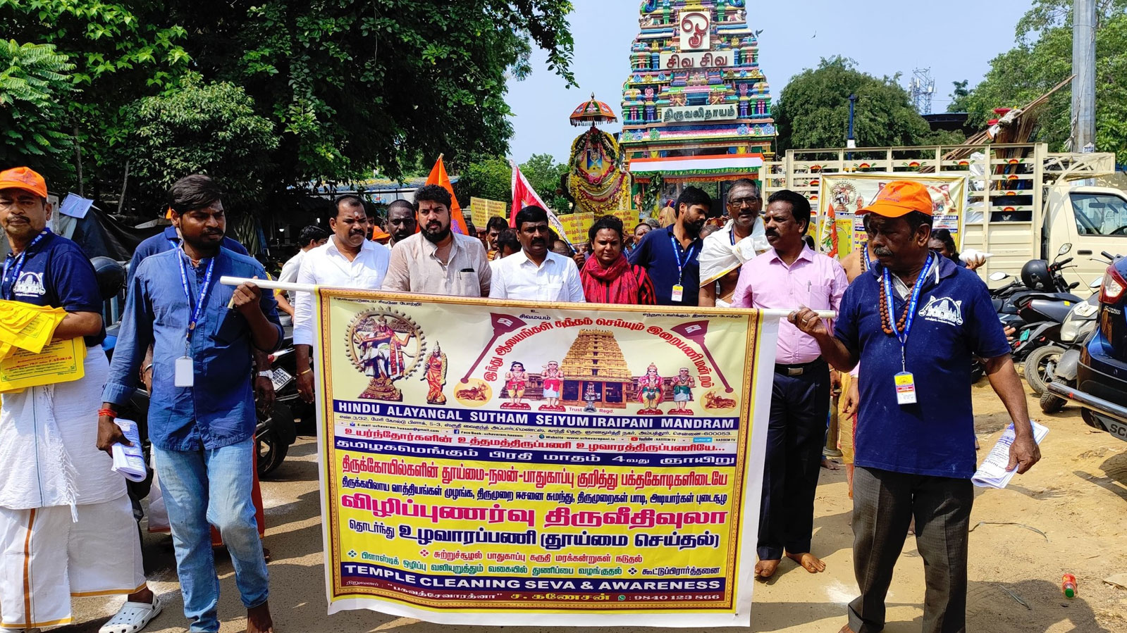 இந்து ஆலயங்கள் சுத்தம் செய்யும் இறை பணி மன்றம் சார்பில் கடந்த 23 ஆண்டுகளாக தமிழகமெங்கும் உள்ள திருக்கோயில்களின் தூய்மை நலன் பாதுகாப்பு குறித்து பக்த கோடிகளிடையே பன்னிரு திருமுறை நாதர் சுமந்து கயிலாய வாத்தியங்கள் முழங்க விழிப்புணர்வு பதாகைகள் ஏந்தி பிரச்சுரங்கள் வழங்கி விழிப்புணர்வு ஏற்படுத்தி வருகிறோம் தொடர்ந்து உழவாரப்பணி (தூய்மை செய்தல்) மற்றும் சுற்றுச்சூழல் பாதுகாப்பு கருதி மரக்கன்று நடுதல் மற்றும் பிளாஸ்டிக் தவிர்க்கும் வகையில் துணிப்பை வழங்குதல் இறுதியாக ஐந்தெழுத்து மந்திரம் ஓதி உலக நலன் வேண்டி கூட்டுப் பிரார்த்தனை