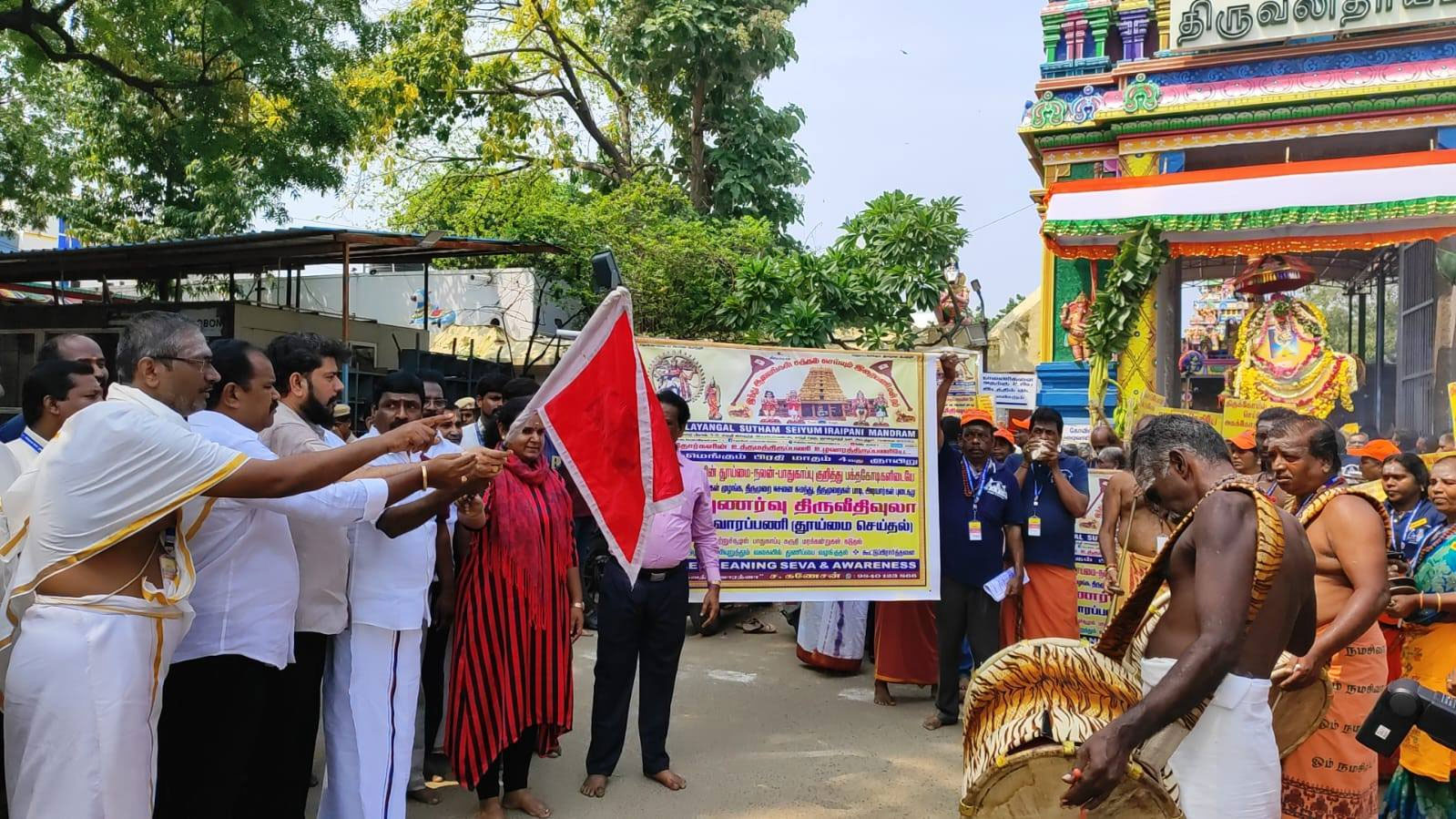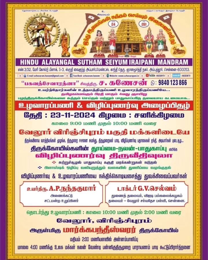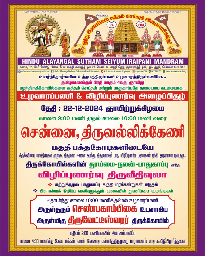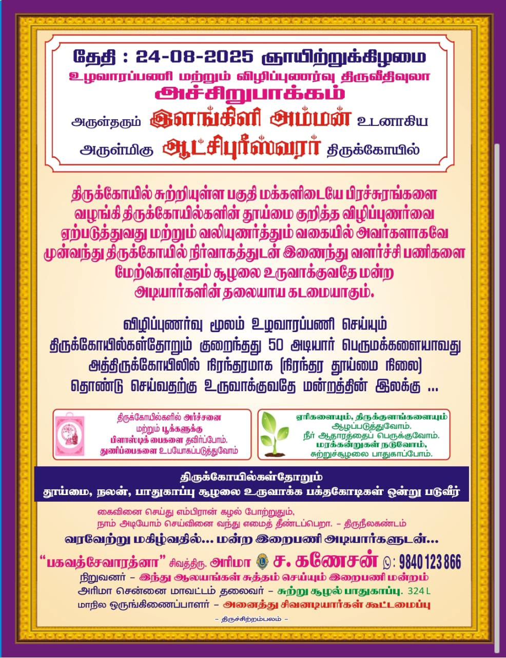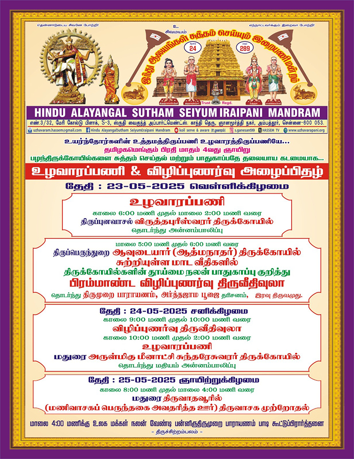 இந்து ஆலயங்கள் சுத்தம் செய்யும் இறை பணி மன்றம் சார்பில் கடந்த 23 ஆண்டுகளாக தமிழகமெங்கும் உள்ள திருக்கோயில்களின் தூய்மை நலன் பாதுகாப்பு குறித்து பக்த கோடிகளிடையே பன்னிரு திருமுறை நாதர் சுமந்து கயிலாய வாத்தியங்கள் முழங்க விழிப்புணர்வு பதாகைகள் ஏந்தி பிரச்சுரங்கள் வழங்கி விழிப்புணர்வு ஏற்படுத்தி வருகிறோம் தொடர்ந்து உழவாரப்பணி (தூய்மை செய்தல்) மற்றும் சுற்றுச்சூழல் பாதுகாப்பு கருதி மரக்கன்று நடுதல் மற்றும் பிளாஸ்டிக் தவிர்க்கும் வகையில் துணிப்பை வழங்குதல் இறுதியாக ஐந்தெழுத்து மந்திரம் ஓதி உலக நலன் வேண்டி கூட்டுப் பிரார்த்தனை